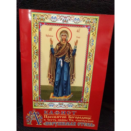 Ангел предстатель послан быстъ от Бога к Тебе, Пречистая, благовестити Тебе радость всемирную, яко зачнеши от Духа Свята во утробе Твоей Бога Слова, Спасителя мира. Мы же, ведуще исполнение сего благовещения, веруем, яко Господь Тебе, Преблагословенная, яви Стеною Нерушимою и ограждение нас от всякого греха, бед и напастей. Сего ради ублажаем Тя, Богородице, и радостно вопием: Радуйся, яко Господь с Тобою и Тобою с нами; радуйся, яко в Кане Галилейстей Предстательницею к Сыну Твоему о людех явилася еси. Радуйся, яко омофором Твоим ширше облака покрываеши верных; радуйся, яко лентием Твоим слезы страждущих отираеши. Радуйся, яко воздеваеши руце Твои во ограждение нас от всякия скверны; радуйся, яко по глаголу Твоему ныне и присно ублажаешися. Радуйся, Богородице, Стено Нерушимая, Заступнице наша и утешение.