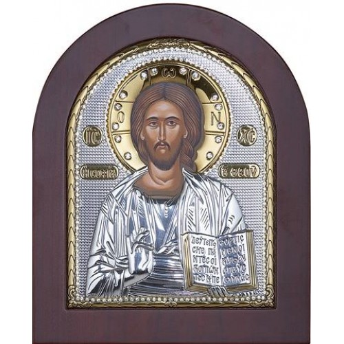 Икона серебрянная 200x250 Христос Спаситель деревянная основа шелкография позолота много камней
